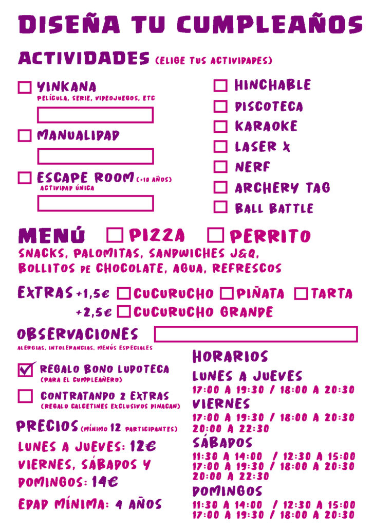 Se puede realizar vía telefónica, whatsapp o mail, para lo que necesitamos 4 datos: nombre del cumpleañer@, años que va a cumplir, un teléfono de contacto y una fecha para que os paséis por la ludoteca