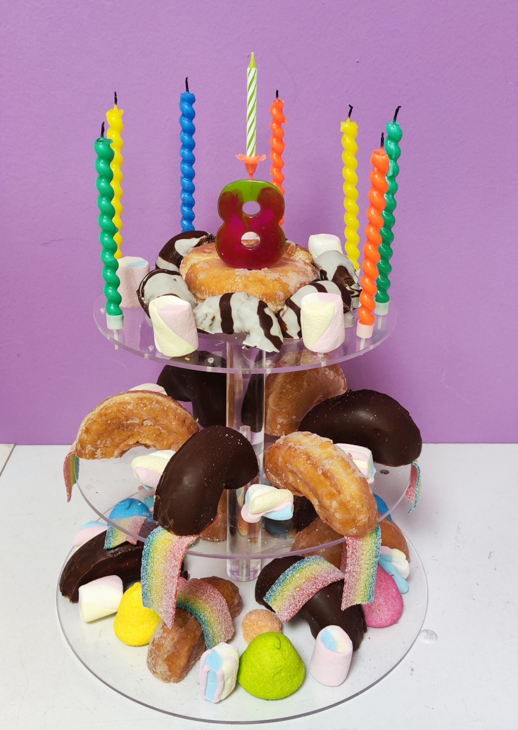 - Hay dos cosas que no están dentro del precio; por un lado, la tarta, nosotros os ofrecemos una tarta de donuts, donettes y chuches por 1,5 € más por niño, pero os damos la opción de traer su tarta favorita de fuera, ya sea comprada o casera. Por otro lado, las chuches que se suelen dar al final del cumple, que os las ofrecemos en forma de cucurucho o piñata, cuestan 1,5 € más por niño y por 2,5 € disponen de un cucurucho extra grande, ambas cosas se pueden traer de fuera. Si escogéis las dos opciones con nosotros, el cumpleañero tendrá un regalo de unos calcetines antideslizantes de Dinacan.